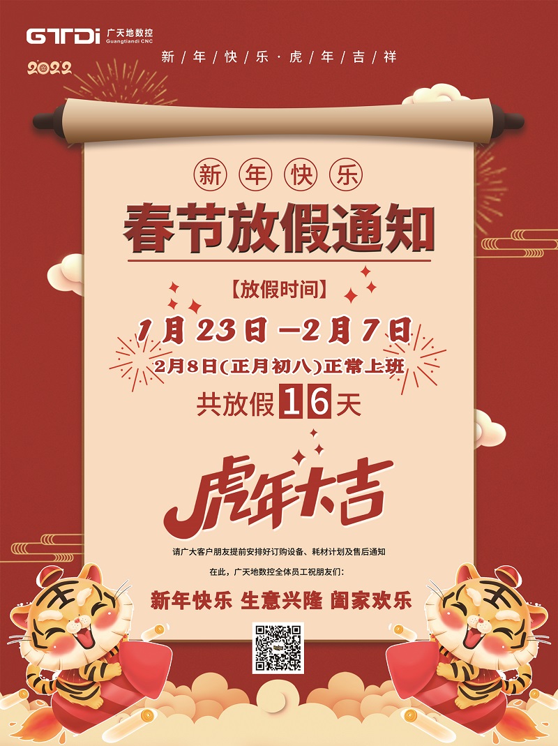 2022年春節(jié)將至,首先感謝您在2021年里的鼎力支持和愉快合作,廣天地?cái)?shù)控全體同仁在此給您拜個(gè)早年。在新年的一年里,我們將更加努力,為您提供更優(yōu)質(zhì)的服務(wù)。按照國(guó)家春節(jié)放假規(guī)定結(jié)合我司的具體情況,春節(jié)放假時(shí)間安排如下: