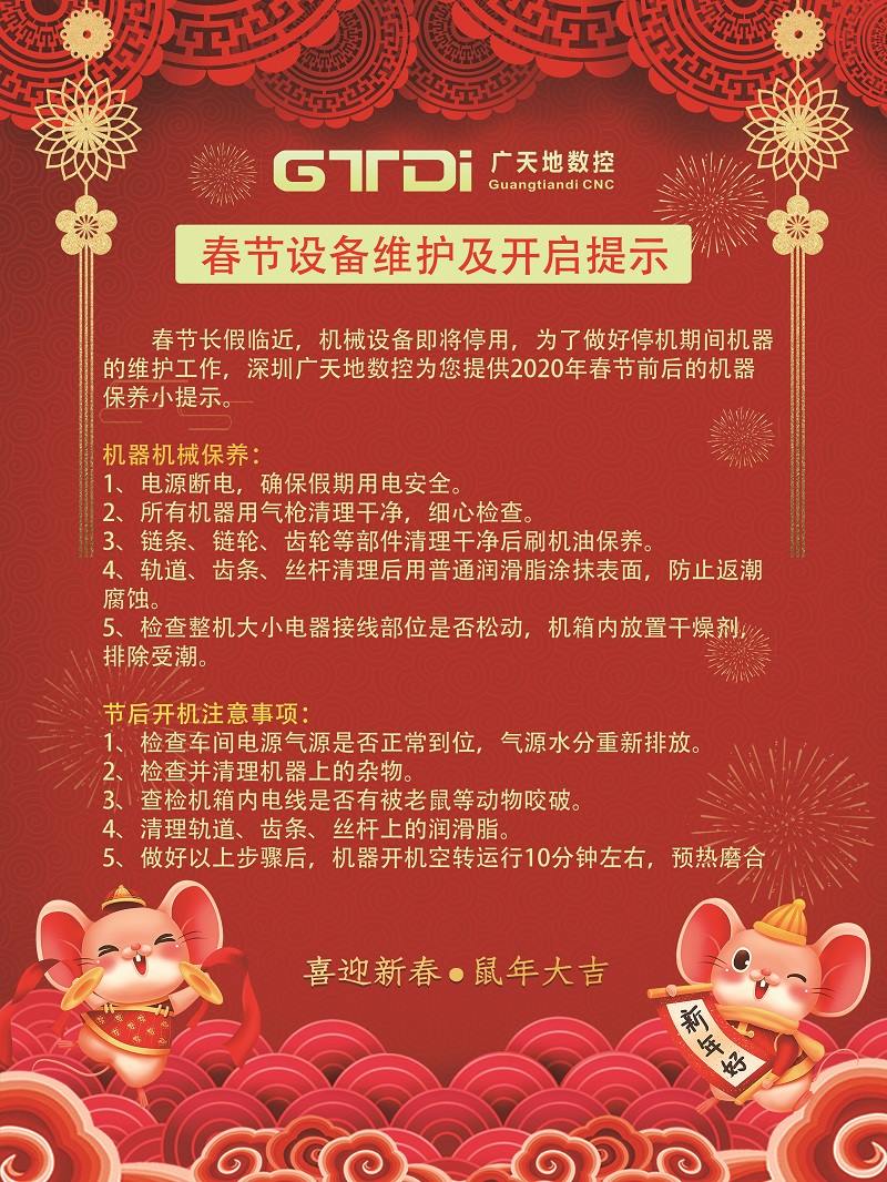 春節長假臨近,機械設備即將停用,為了做好停機期間機器的維護工作,深圳廣天地數控為您提供2020年春節前后的機器保養小提示。